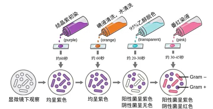 厌氧菌根据对氧气的需求和耐受也可分为三类:专性厌氧菌无法进行有氧代谢,氧气可引起此类细菌的毒性反应和死亡,如破上风梭菌;兼性厌氧菌在有氧或无氧环境中均能生长繁殖,同时具有有氧呼吸和无氧发酵等功能,如酵母菌;耐氧厌氧菌在有限时间内可以耐受氧气或无氧条件下生存较好,而有氧条件下生存不佳,如溶组织梭菌。根据染色情况分类1882年丹麦细菌学家革兰(Hans Christian Gram)提出革兰氏染色法,旨在通过细胞壁的结构差异来区分两种类型的细菌。