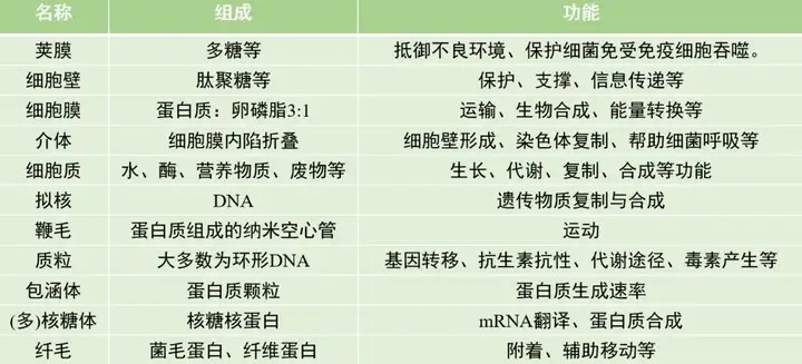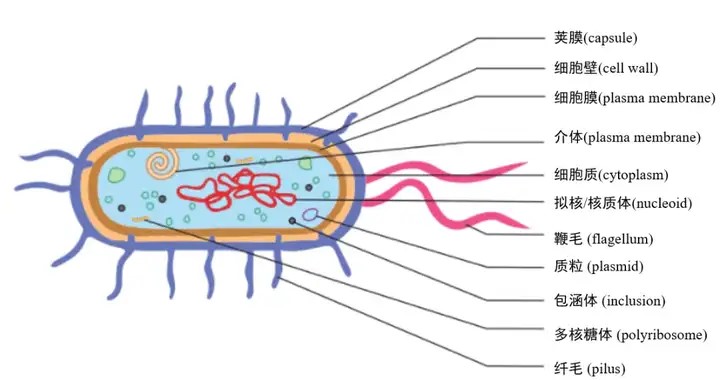 细菌均为单细胞原核生物,且遗传物质均为DNA。相比于真核细胞,细菌无细胞核(为拟核/核质体),核糖体为唯一细胞器。不过细菌中存在其他一些结构。