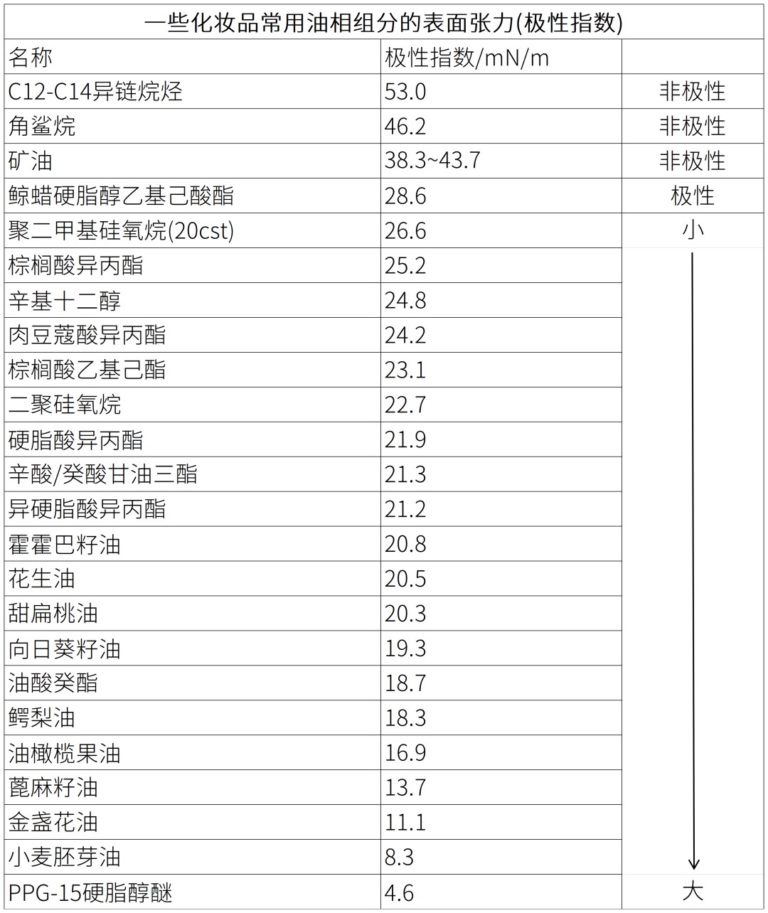 化妆品常用油相组分的表面张力(极性指数)指数越低,极性越强。