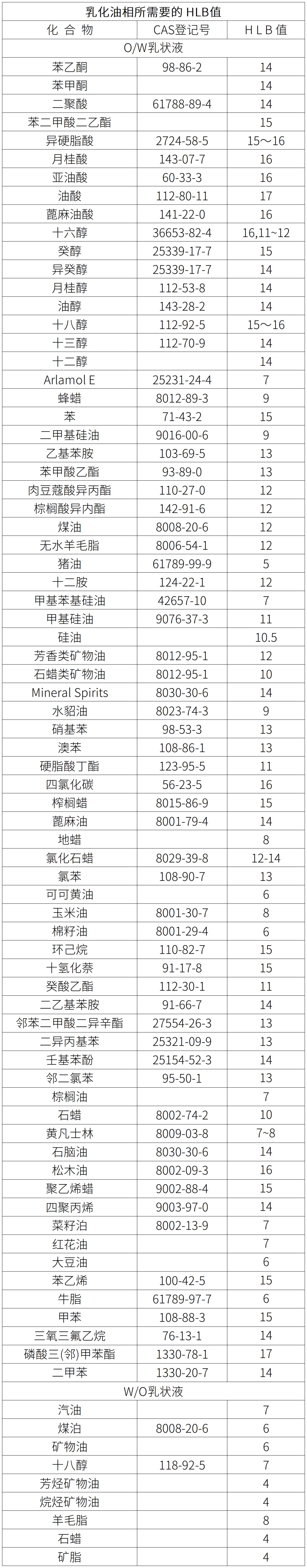 每种乳化剂都有特定的HLB值,单一乳化剂往往很难满足由多组分组成的体系的乳化要求。通常将多种具有不同HLB值的乳化剂混合使用,构成混合乳化剂,既可以满足复杂体系的要求。