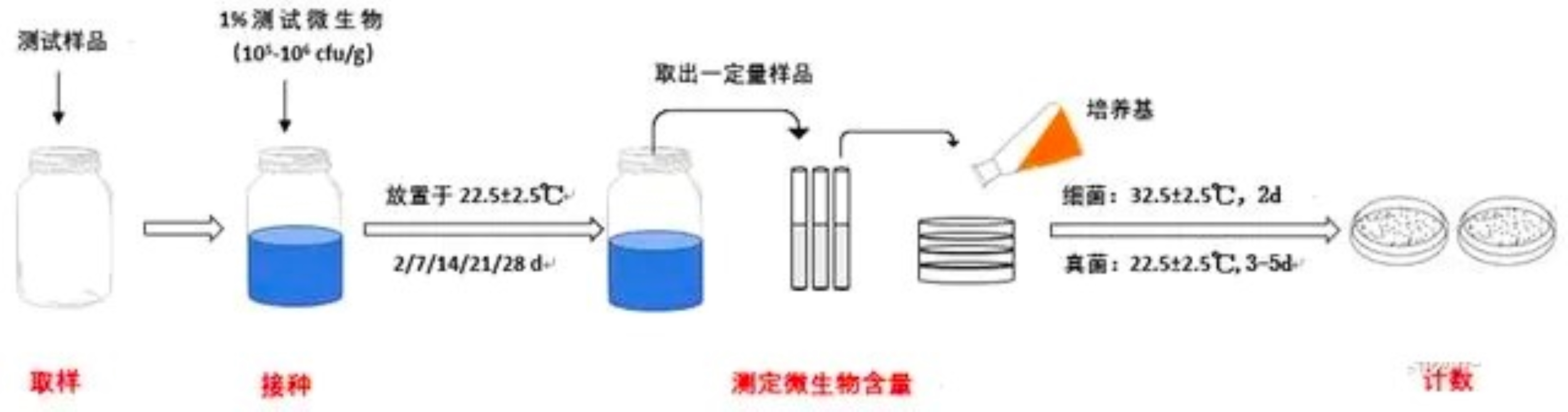 防腐挑战试验采用单一菌种染菌的测试方式,即分别用每种测试菌株的菌悬液人工污染供试品,每隔一定时间检测其中的存活菌量,根据存活菌量的变化判断化妆品防腐体系效能。