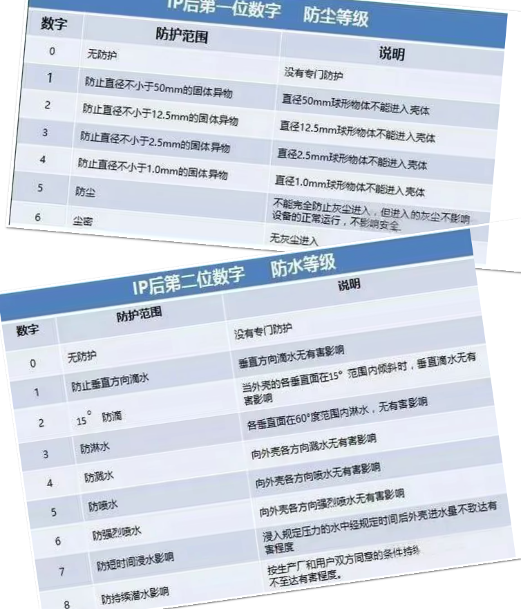 IP后面的两位数字,表示该设备外壳对于固体异物和水侵入的防护强度,第1个数字表示电器设备防尘、防止外物侵入的等级,第2个数字表示设备防湿气、防水侵入的密闭程度,数字越大表示其防护等级越高。