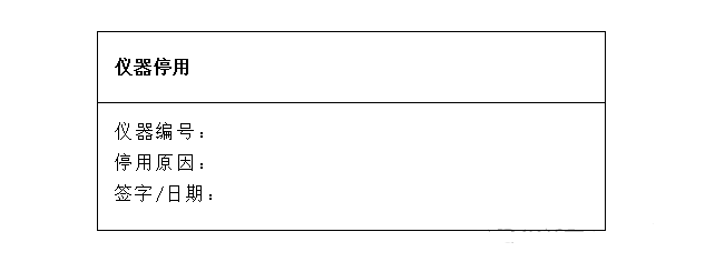 当仪器校准不合格,校准没有在规定的日期前完成,或者仪器需要维修不能使用时,应有明显的停用标识,表示仪器不能使用。禁止使用标识要能够实现提醒作用,根据需要设计内容,但需要根据标签内容追溯到对应的仪器和原因,如以防止仪器的误用。禁止使用标签示例(红色标签):