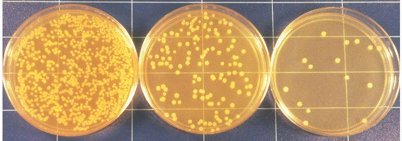 先用肉眼观察,点数菌落数,然后再用5倍~10倍的放大镜检查,以防遗漏。记下各平皿的菌落数后,求出同一稀释度各平皿生长的平均菌落数。若平皿中有连成片状的菌落或花点样菌落蔓延生长时,该平皿不宜计数。若片状菌落不到平皿中的一半,而其余一半中菌落数分布又很均匀,则可将此半个平皿菌落计数后乘以2,以代表全皿菌落数。