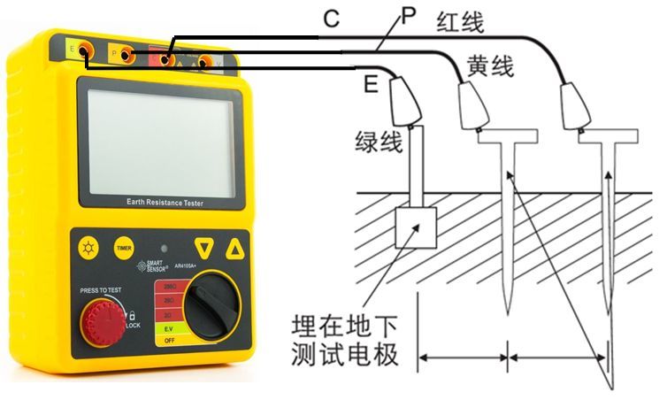 条件:必须有两个接地棒:一个辅助地和一个探测电极。各个接地电极间的间隔不小于20米。原理是在辅助地和被测地之间加上电流,测量被测地和探测电极间的电压降,测量结果包括测量电缆本身的电阻。