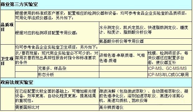 2)卫生项目检测的实验室配置参见“1. 企业实验室”相关段落。个人认为对于一个现代商业实验室液相色谱-串联质谱、气相色谱-质谱是不可少的,这是现在对禁用农兽药残出具阳性报告时指令和标准 要求的条件。如果有规模、检测项目多,每类仪器还应配置多台套。这时要考虑仪器性能的互补,如:液相色谱-串联质谱一台配电喷雾电离源,一台配大气压化学 电离源;气相色谱-质谱一台配电子轰击源,一台配负化学电离源。元素多、样品杂,还可以考虑配置等离子发射光谱-质谱仪、气相色谱-串联质谱仪等。如果要 做形态分析,等离子发射光谱-质谱仪还应能与液相色谱或气相色谱联用。