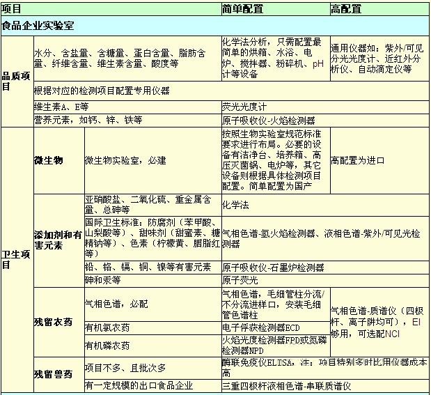 1)检测品质项目通常要考虑使用的标准或根据客户要求,配置相应的检测仪器和设备(参照1. 企业实验室品质项目一段)。由于不同商品和不同客户可对同一项目可能提出不同的检测标准或方法,对于这些项目的检测,若方法规定采用化学法分析,只需配置 最简单的设备即可(参照1. 企业实验室品质项目一段)。如果经费充足或检验批次较多,对应的检测方法又有仪器法的,可配置相应的专用仪器,如:水分测定仪、凯氏定氮仪、快速脂肪测定 仪、糖度计、粘度计、脂肪酸分析仪等。通用仪器也可参照企业实验室品质项目一段。如果有需要,像氨基酸分析仪这样的专用分析仪也可以配置。