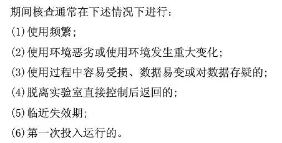期间核查情况应记录并归档。期间检查中发现设备运行有问题时,应停用保修,对运行有问题的设备所涉及检测结果有效性有影响时,应对检测项目进行重新检测。